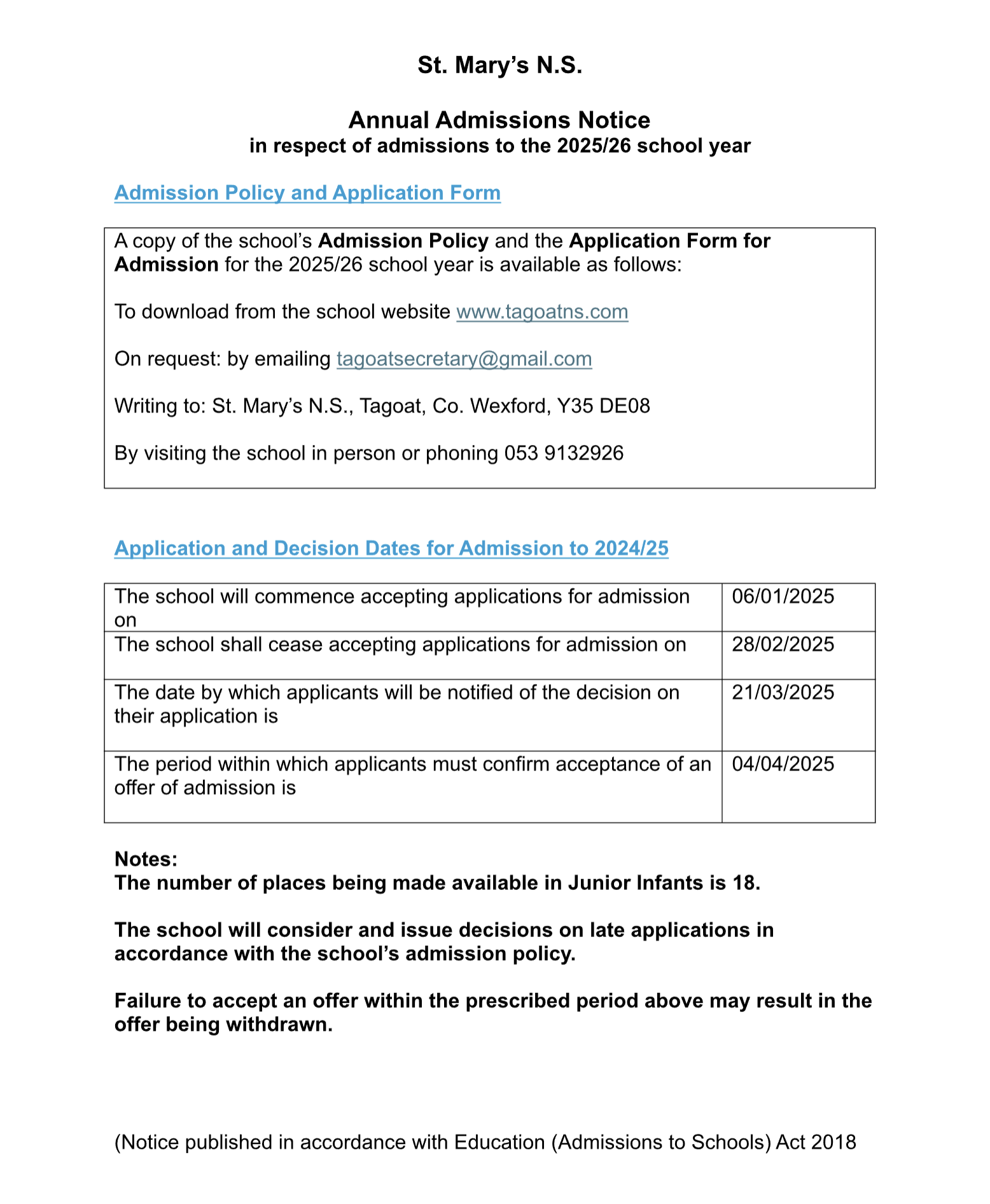 Welcome to St. Mary’s N.S, Tagoat, where educational and social development go hand in hand. Our tailored focus on academics and the whole child means that every child will find a happy home here.